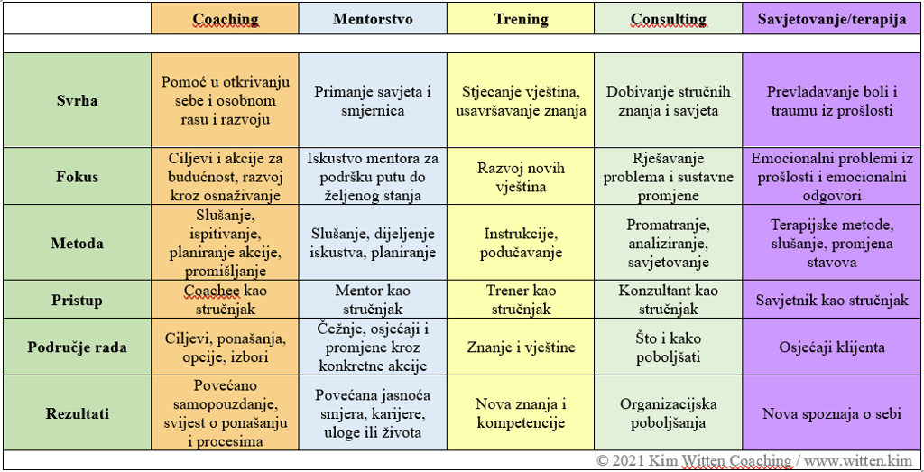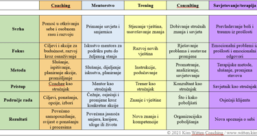 Coaching, mentorstvo, psihoterapija, trening i consulting - koje su razlike? Kada se nalazimo u situaciji te nailazimo na određene teškoće, ali i izazove teško nam je odrediti koji stručnjak nam je potreban. Sve djeluje kao odgovarajuće, ali i zbunjujuće. Kako to da neki idu na coaching, a htjeli su psihoterapijski raditi na nekom poručju? Kako to da netko ide i na coaching i psihoterapiju, zar nije to isto?